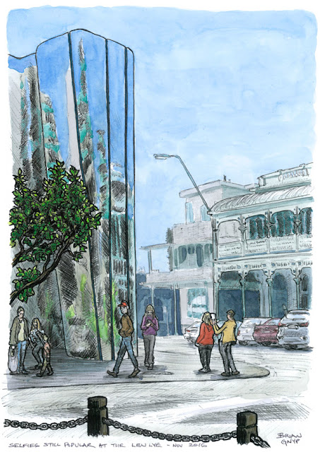 After one year, it's still quite popular to take a selfie against the stainless steel walls on the Len Lye Centre.